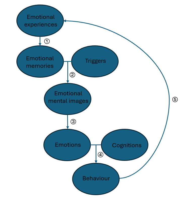 The core principle in the Emotional Learning Model is that a trigger in the current situation generates new mental images for the person based on these emotional memories (②). This trigger can be something in the environment or an internal trigger and these mental images can be of the past or the future. These mental images also carry emotions and the type and strength of the emotions is based on the emotional memories. That’s how mental images cause a person to experience emotions in the current moment (③).